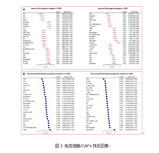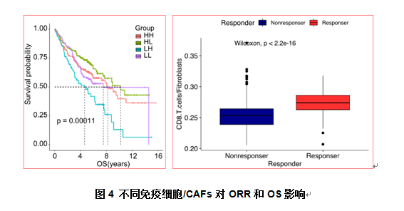 肿瘤的发生发展不仅与肿瘤细胞本身有关, 还与肿瘤微环境有密切关系。肿瘤相关成纤维细胞(cancer associated fibroblasts,CAFs)是肿瘤间质中最主要成分之一,CAFs主要来源于肿瘤周围间质组织中的成纤维细胞,成纤维细胞经过肿瘤微环境中一些可溶性的细胞因子诱导, 发生一系列的表型改变及功能基因的差异表达, 从而活化为CAFs。 CAFs在肿瘤免疫应答和免疫治疗中的作用究竟如何?我们科研团队近期也进行了一些初步探索。我们首先利用大数据库中RNAseq数据对免疫细胞浸润与CAFs的关系进行研究,与以往研究发现有所不同的是:CAFs与绝大多数免疫细胞(包括免疫负性细胞)的浸润呈正相关,免疫细胞浸润越多,CAFs量也越多。这一现象提示我们CAFs增多很有可能是肿瘤细胞对肿瘤免疫应答过程中免疫细胞浸润的适应性反应。 我们接着对CAFs对预后影响进行探索,当我们引入CAFs因素后,惊奇的发现一个混乱无序的世界(单一免疫细胞作为预后因素判断,图3a)居然转变了一个干净有序的世界(免疫细胞与CAFs比值作为预后因素判断,图3b)。 免疫细胞/CAFs是一个不错的预后因子,作为疗效预测因子是否可行,研究组进一步想尝试回答这个问题,在多个数据库初步验证高比值的免疫细胞/CAFs无论是ORR、OS均优于低比值的免疫细胞/CAFs。 临床科研的根本目的就是要解决临床实际问题,这项工作仍在进行中,也欢迎志同道合者加入我们的研究团队。该项研究的部分内容已经被2020年ASCO和AACR接受为Poster,再次感谢团队人员的辛苦付出!