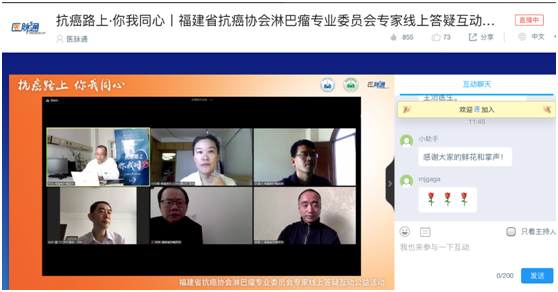 4月19日,全国肿瘤防治宣传周期间,福建省肿瘤医院淋巴瘤头颈肿瘤内科主任、福建省抗癌协会淋巴瘤专业委员会主任委员杨瑜教授牵头开展了大型网络专家线上答疑互动公益活动,邀请福建省肿瘤医院放疗科主任吴君心教授、福建省肿瘤医院病理科主任陈刚教授、厦门大学附属第一医院血液科主任徐兵教授、福建医科大学附属协和医院血液科主任医师付丹晖教授、福建省肿瘤医院淋巴瘤内科、头颈肿瘤内科副主任医师陈道光教授等省内多名淋巴瘤领域专家参加。
