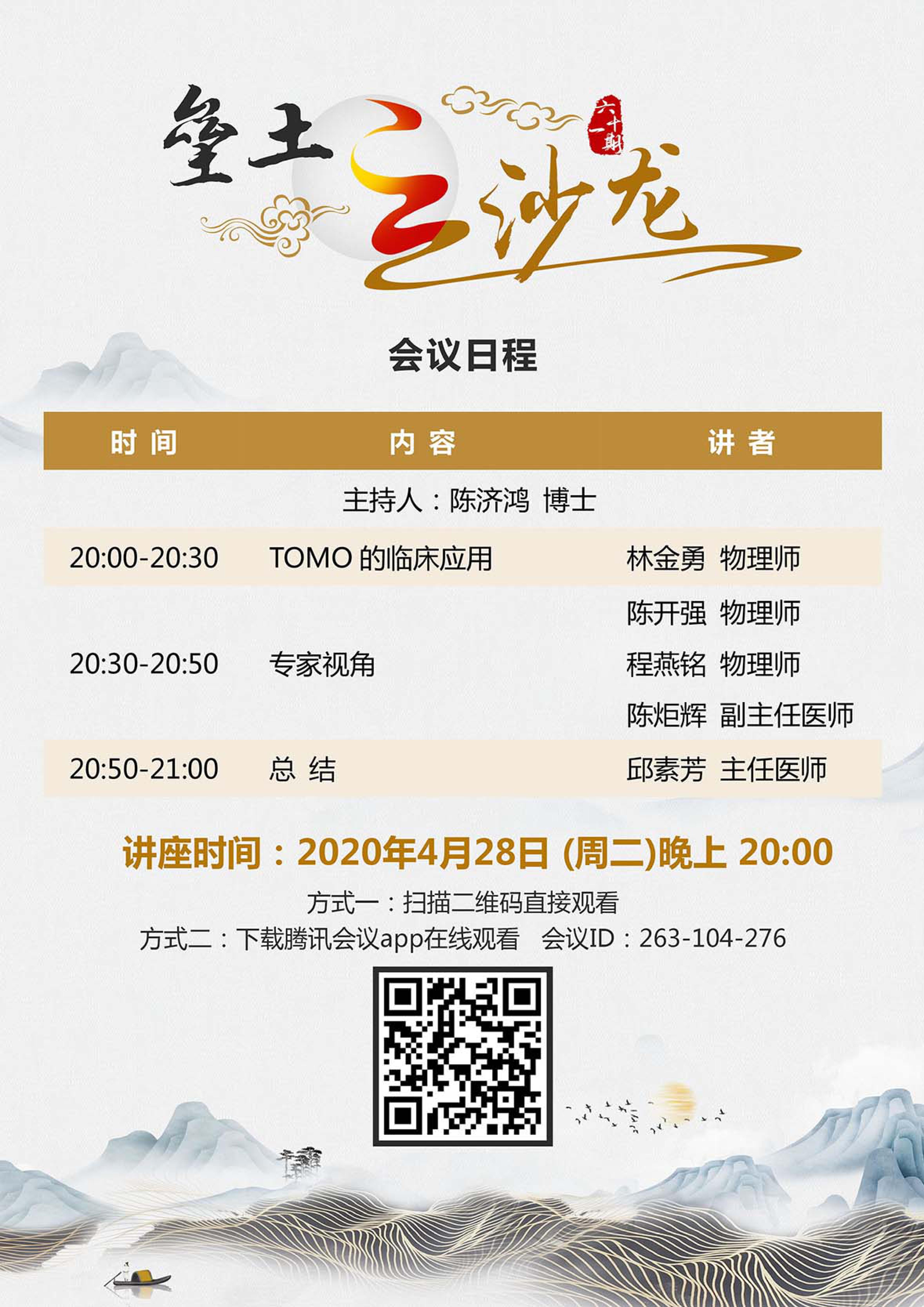 61期垒土沙龙活动我们请来了我院林金勇物理师给我们分享“TOMO的临床应用”,此次沙龙可谓是众星云集,会议将由我院物理组陈济鸿博士主持,陈炬辉副主任医师、陈开强物理师、程燕铭物理师担任讨论嘉宾,相信会给我们带来新的视听盛宴。