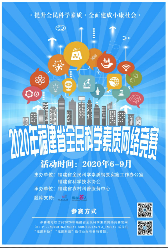 为深入学习贯彻习近平新时代中国特色社会主义思想和党的十九大精神,全面落实省委十届九次全会决策部署,扎实推进公民科学素质建设,福建省全民科学素质纲要实施工作办公室、福建省科学技术协会举办2020年福建省全民科学素质网络竞赛活动。