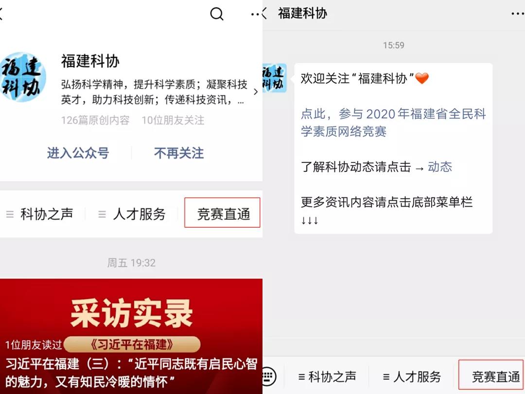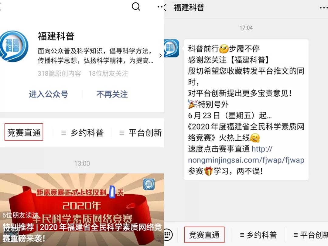 通过访问2020年福建省全民科学素质网络竞赛官网(http://nongminjingsai.com/fujian/fj_index)或关注“福建科普”“福建科协”微信公众号参与答题。