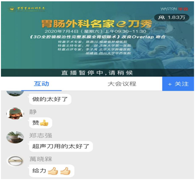 直播过程中,吉林大学第一医院所剑教授主持,由北京大学肿瘤医院李子禹教授,四川大学华西医院胡建昆教授作为线上点评嘉宾,对陈路川主任的精湛手艺和创新理念赞叹不已。直播过程在线人员峰值达1.83万人,后台数据显示70%人全程观看了手术过程。在线观众纷纷留言表示,陈路川主任带来的这场首秀体现了“理论”与“实践”相结合的原则,深入人心,影响广泛。