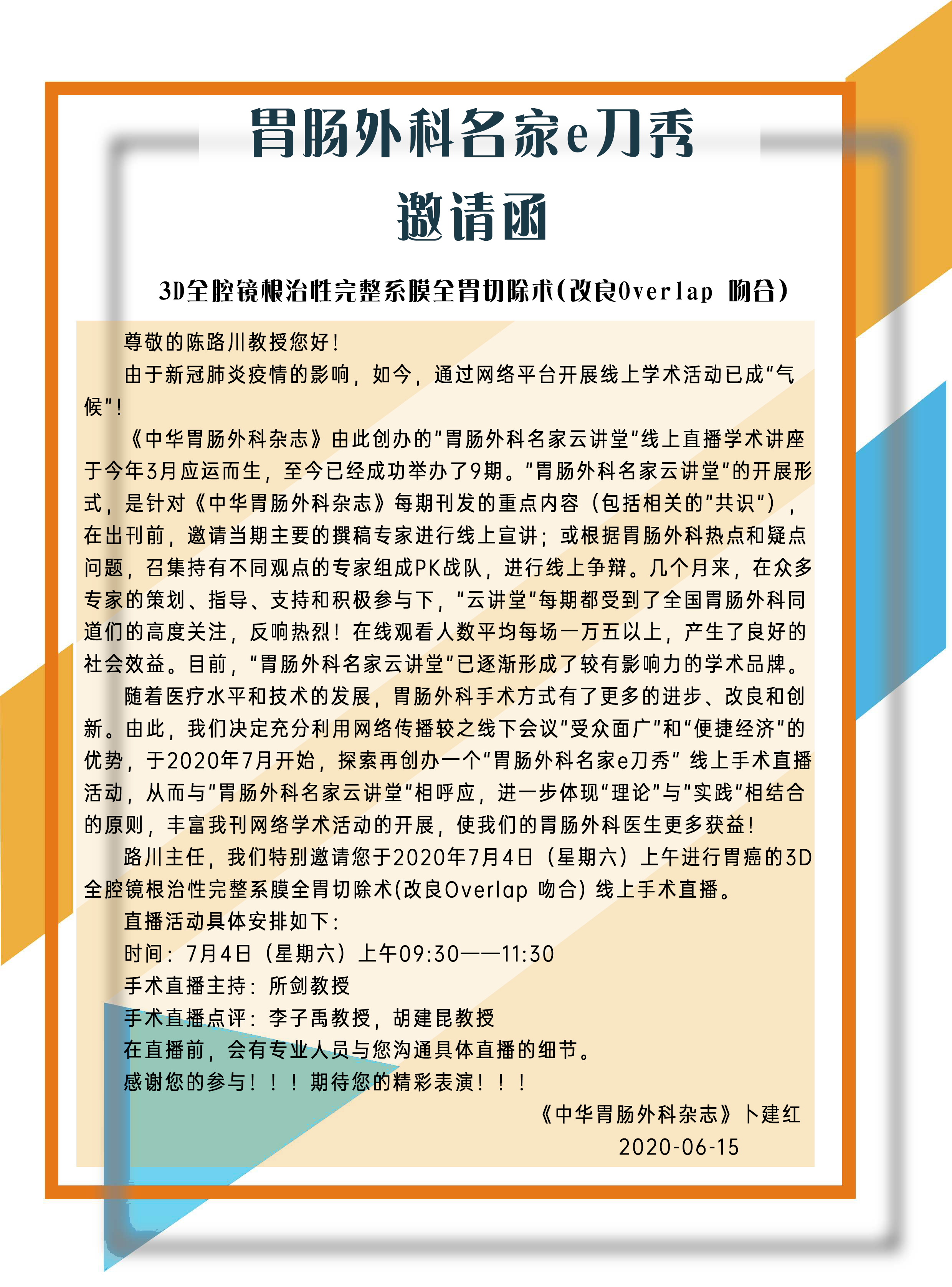 受新冠肺炎疫情的影响,通过网络平台开展线上学术活动已成“气候”。2020年7月起,作为国内胃肠外科专业学术期刊知名度及影响力均首屈一指的《中华胃肠外科杂志》创办“胃肠外科名家e刀秀” 线上手术直播活动,特邀我国顶尖知名胃肠外科学者以线上手术直播方式进行胃肠外科手术的展示和交流。受杂志社邀请,我院胃肠外科主任陈路川教授成为该活动进行胃癌腹腔镜手术的首秀专家,而第二场手术则由我国结直肠癌外科领军人物、中国抗癌协会大肠癌专业委员会候任主任委员、中国医学科学院附属肿瘤医院王锡山教授进行肠癌腹腔镜手术的演示。在此次的“胃肠外科名家e刀秀”首秀中,陈路川主任及团队圆满完成了“3D完全腹腔镜完整系膜切除根治性全胃切除术(改良Overlap 吻合)”,为全国在线观众呈现了一场精彩纷呈的“视觉盛宴”。