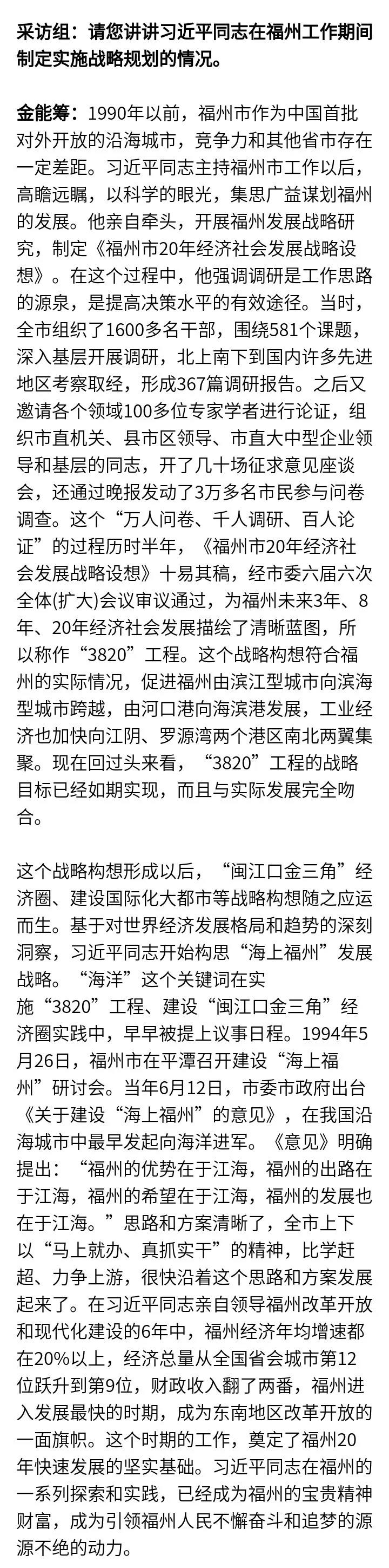 采访对象:金能筹,1941年10月生,福建闽侯人。1983年2月任福州市委常委兼市委秘书长。1984年3月任福州市委副书记,其间先后兼任市委秘书长、市纪委书记、市政协主席。1993年2月任福州市市长。1995年5月任福建省政协副主席兼省委统战部部长。2010年5月退休。