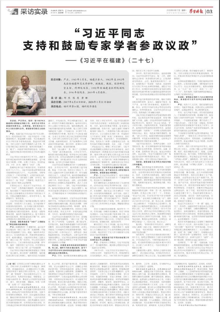采访对象:严正,1943年5月生,福建沙县人。1982年至1992年先后任福建师范大学讲师、副教授、教授,经济研究室主任,科研处处长。1992年任福建省社科院副院长,1996年任院长。2009年4月退休。 采 访 组:邱 然 陈 思 黄 珊 采访日期:2017年6月4日初访,2020年1月11日核访 采访地点:福州市芳沁园,福州悦华酒店