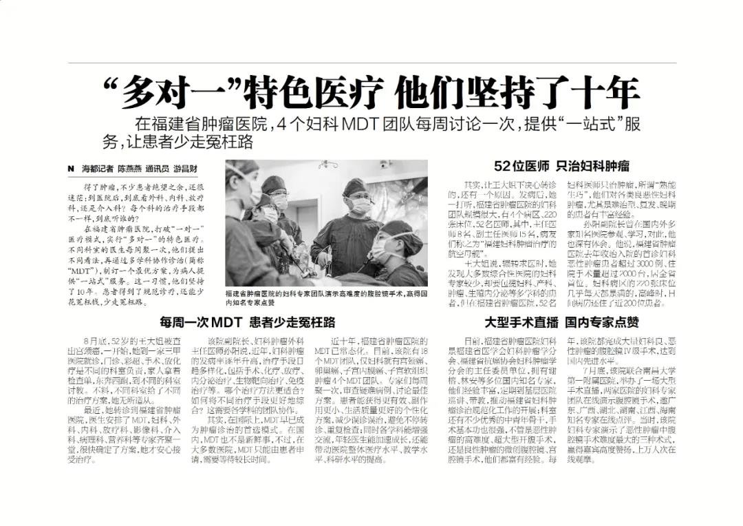 在福建省肿瘤医院,打破“一对一”医疗模式,实行“多对一”的特色医疗。不同科室的医生每周聚一次,他们提出不同看法,再通过多学科协作诊治(简称“MDT”),制订一个最优方案,为病人提供“一站式”服务。这一习惯,他们坚持了10年。患者得到了规范诊疗,还能少花冤枉钱,少走冤枉路。