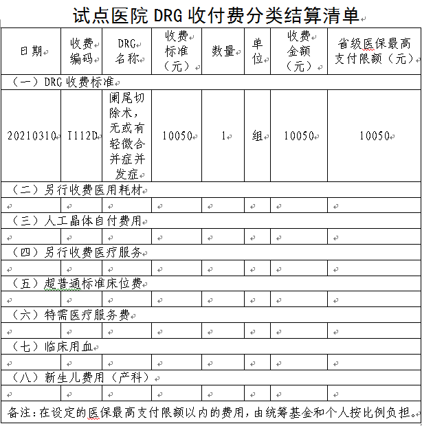 例如:福州市职工医保患者住院主要诊断为“急性阑尾炎”,本次住院做“阑尾切除术”,无其他合并症并发症,达到治疗效果出院。按照该患者的诊断及治疗方案,归入“阑尾切除术,无或有轻微合并症并发症”组,按本组事先确定的10050元收取,其中个人自付30%即3015元,医保基金支付70%即7035元。出院时医院提供给患者的结算清单如下: