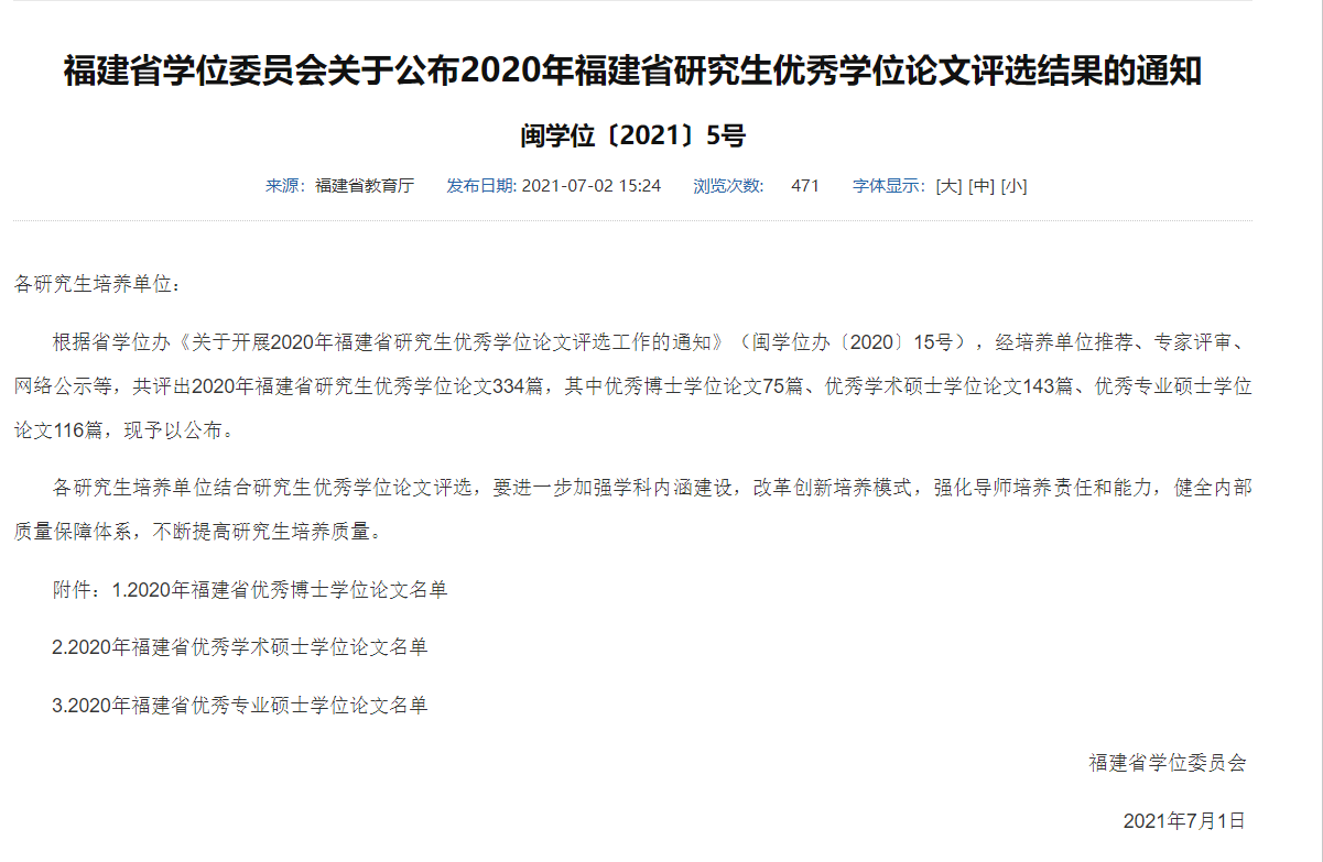 近日,由福建省学位委员会组织开展的2020年福建省研究生优秀学位论文评选结果揭晓,我院培养的两位研究生获“2020年福建省优秀专业硕士学位论文”奖。据悉,本年度评审共评出研究生优秀学位论文334篇,其中优秀博士学位论文75篇、优秀学术硕士学位论文143篇、优秀专业硕士学位论文116篇。
