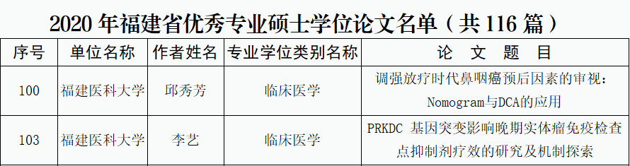 我院获奖的两名专业硕士研究生毕业论文分别为邱秀芳的《调强放疗时代鼻咽癌预后因素的审视:Nomogram与DCA的应用》和李艺的《PRKDC 基因突变影响晚期实体瘤免疫检查点抑制剂疗效的研究及机制探索》。她们在研究生三年期间认真学习临床知识,工作之余积极开展实验研究,并且在导师陈传本教授的悉心指导下建立了独立的创新思维,积累了丰富的理论知识,在临床实践中学以致用以用促学,提炼形成优秀的学术论文。