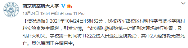 10月24日,南京消防通报江宁区将军大道29号南京航空航天大学将军路校区一实验室发生爆燃,共造成2人死亡,9人受伤。