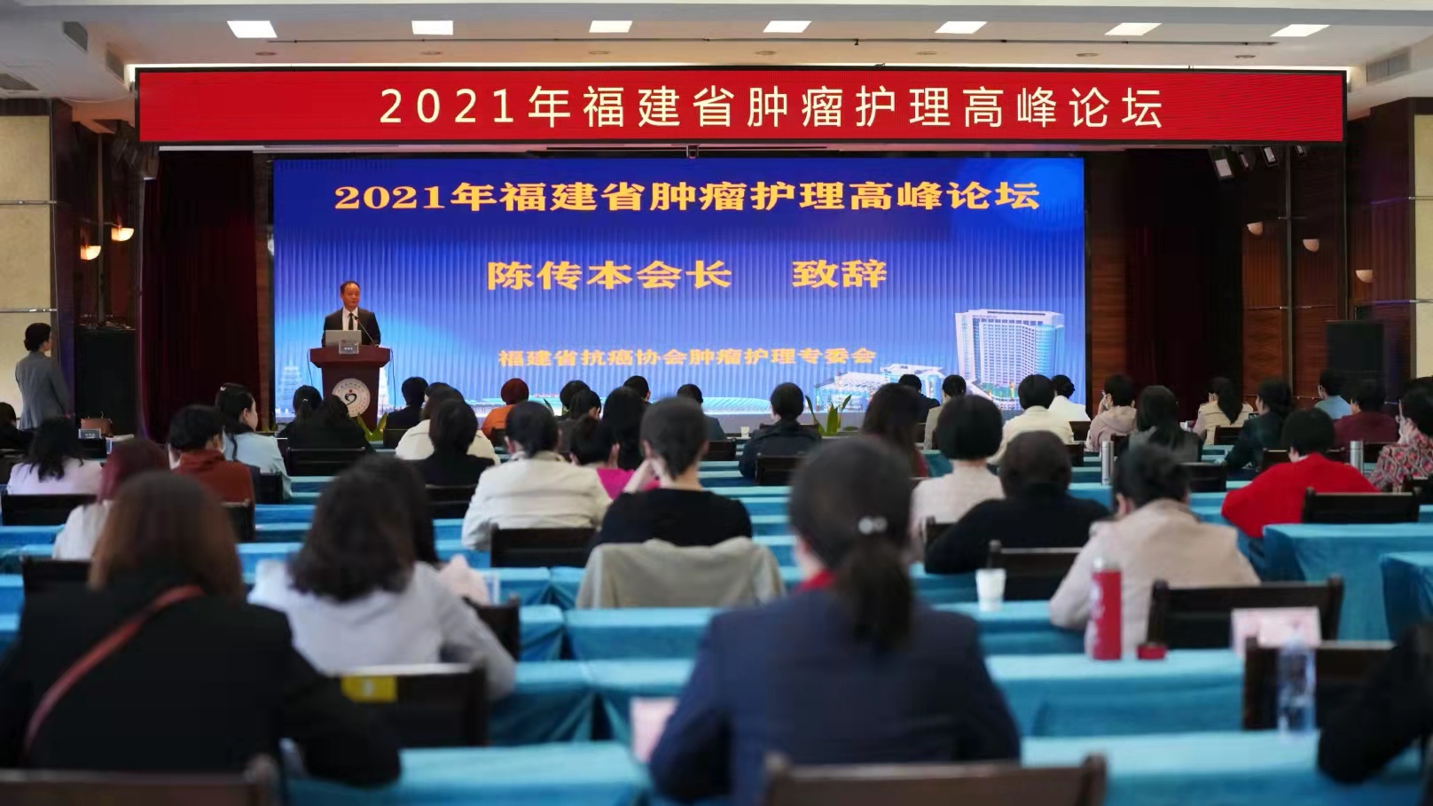 福建省肿瘤医院院长、福建省抗癌协会会长陈传本教授及福建省抗癌协会肿瘤护理专业委员会主任委员骆惠玉教授为大会开幕式致辞。