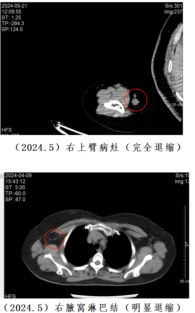 最初,郭女士对参与临床研究抱有疑虑,担心未知的治疗方案可能带来的风险和不确定性。但随着时间的推移和治疗的深入,她的态度发生了明显变化。在6周的治疗后,她的肿瘤就缩小了30.26%。一年多来,郭女士相继完成了22周期的“DNV3+特瑞普利单抗”治疗,肿瘤持续稳定退缩。最近一次复查,肿瘤相比最初缩小了58.56%,病情取得阶段性控制。