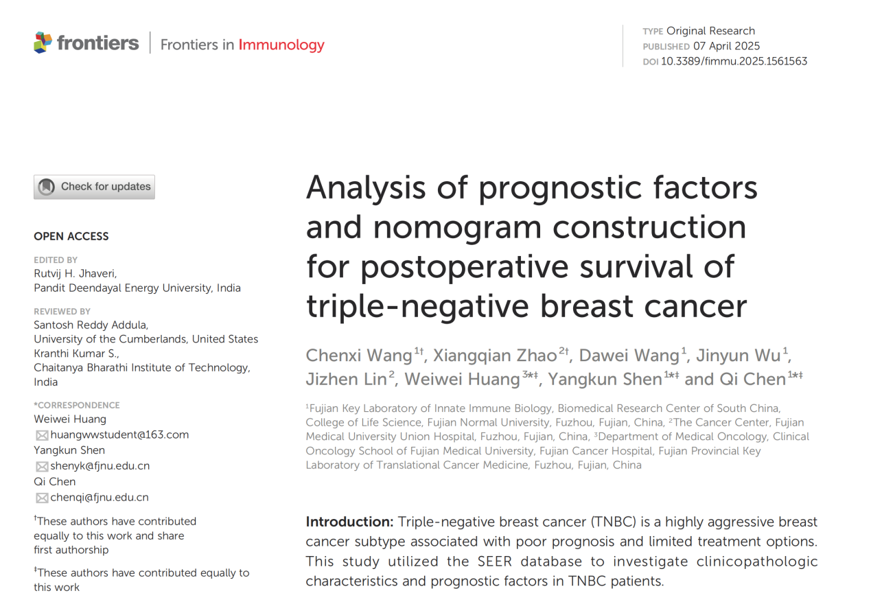 近日,我院乳腺肿瘤内科黄伟炜主任医师作为第一通讯作者的研究成果《Analysis of prognostic factors and nomogram construction for postoperative survival of triple-negative breast cancer(三阴性乳腺癌术后生存期的预后因素分析及列线图构建)》在国际权威期刊《Frontiers in Immunology》(中科院2区)正式发表。此前,黄伟炜团队已在《BMC Cancer》和《Frontiers in Cell and Developmental Biology》连续发表两项TNBC治疗相关成果,此次研究进一步彰显了团队在三阴乳腺癌预后领域的国际影响力。