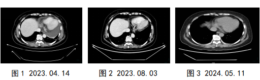 1年多前,蔡女士出现胸闷,活动后气促,癌胚抗原(CEA)稍高于正常。2023年4月,蔡女士来我院复查胸部CT显示:心包见大量积液(最深处3.9cm),穿刺(心包积液)见癌细胞(图1),诊断为宫颈癌多程治疗后心包转移。陈文娟主诊团队对蔡女士进行心包置管引流+局部靶向药物+化疗灌注。经治疗,蔡女士心包积液消退,胸闷气促症状缓解,复查胸部CT(图2)显示心包积液消失,肿瘤标志物恢复正常。近一年来复查影像未见复发,且肿瘤标志物检查均正常(图3)。