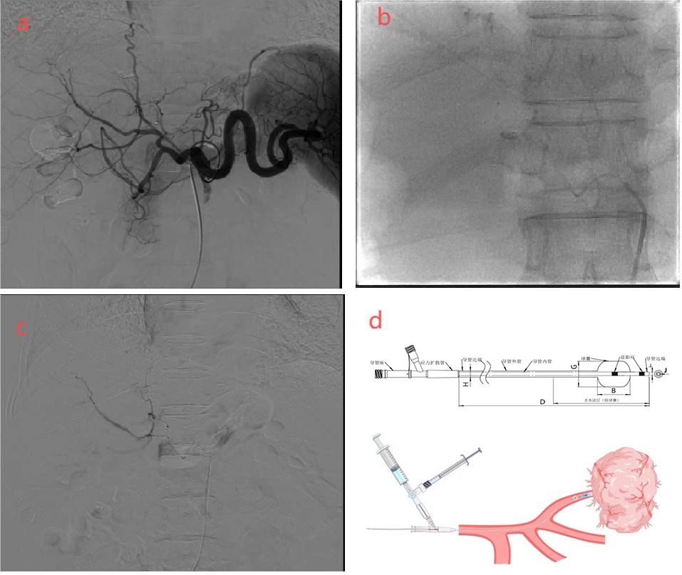 b:球囊导管超选到肿瘤供血动脉近端,球囊充气阻断后加压注入栓塞剂;