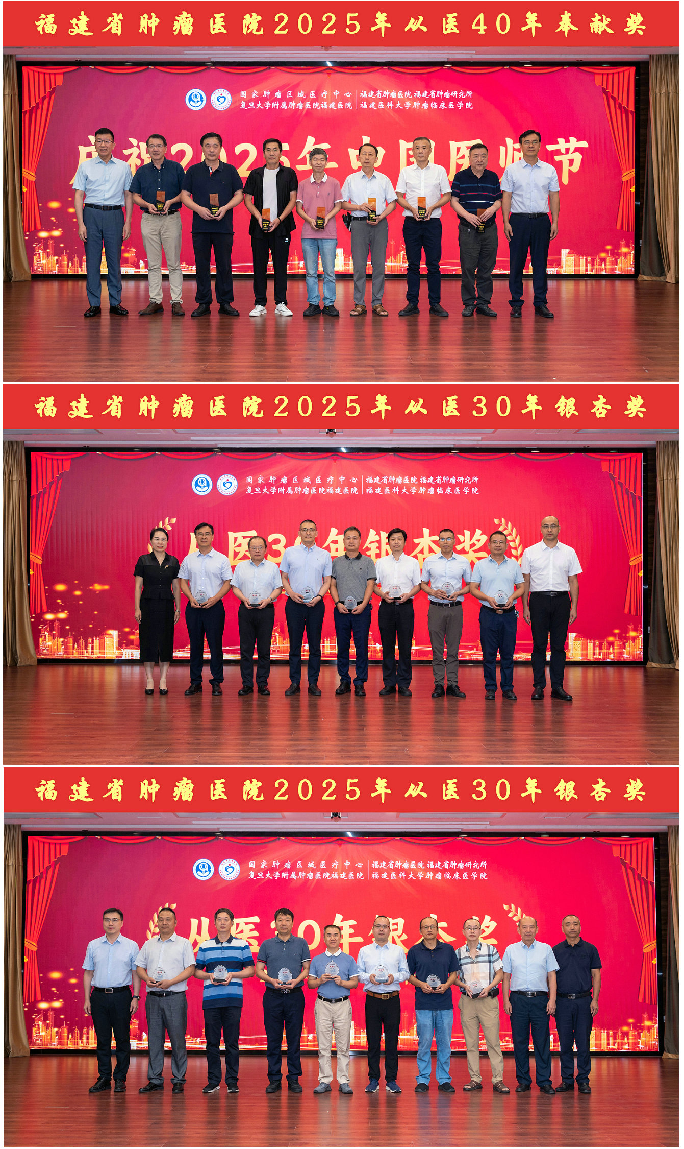 大会隆重表彰了获得“从医40年奉献奖”和“从医30年银杏奖”的医师们。获奖医师们数十年如一日,将青春和智慧奉献给医学事业和医院发展,他们的坚守与付出赢得了全场持久而热烈的掌声,深刻诠释了“德馨于行 技精于勤”的深刻内涵。