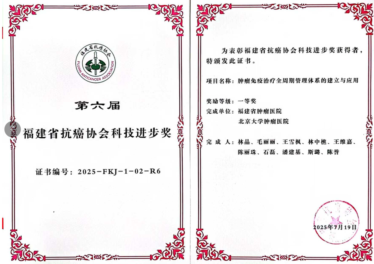 我院黑色素瘤、泌尿软组织肿瘤内科林晶副主任医师团队与北京大学肿瘤医院合作的“肿瘤免疫治疗全周期管理体系的建立与应用”项目获一等奖。该项目建立了系统的免疫治疗管理体系,为提升疗效、减少副作用提供了实践指导。
