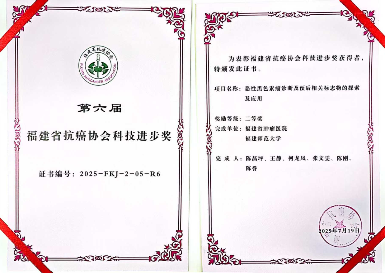 在第六届福建省抗癌协会科技进步奖评选中,我院黑色素瘤研究团队的两项重要成果分别荣获一等奖和二等奖,展现了我院在黑色素瘤诊疗领域的实力。