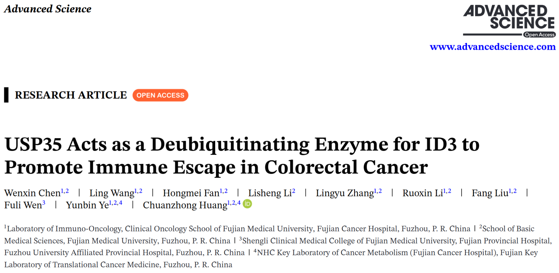 近日,我院肿瘤免疫学研究室研究成果《USP35 acts as a deubiquitinating enzyme for ID3 to promote immune escape in colorectal cancer (USP35作为ID3去泛素化酶促进肠癌免疫逃逸)》在国际权威期刊《Advanced Science》(IF: 14.1,中科院一区TOP)发表。我院黄传钟副主任技师、叶韵斌教授为通讯作者,陈雯昕硕士、王玲主管技师、范红梅技师为共同第一作者。